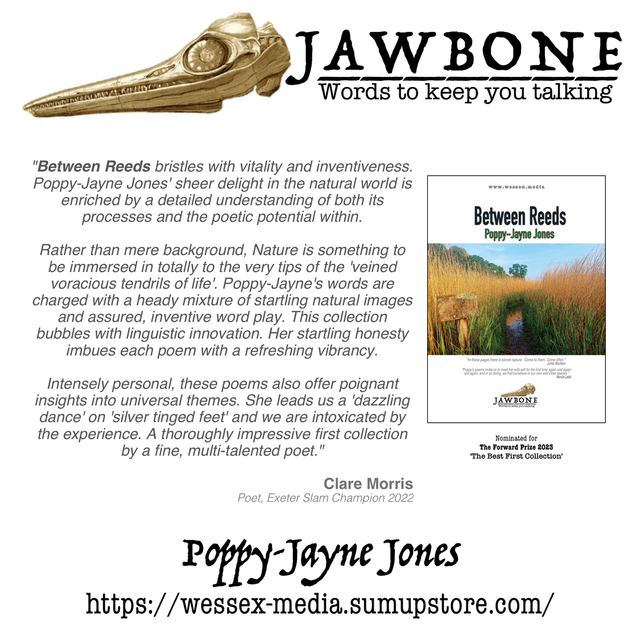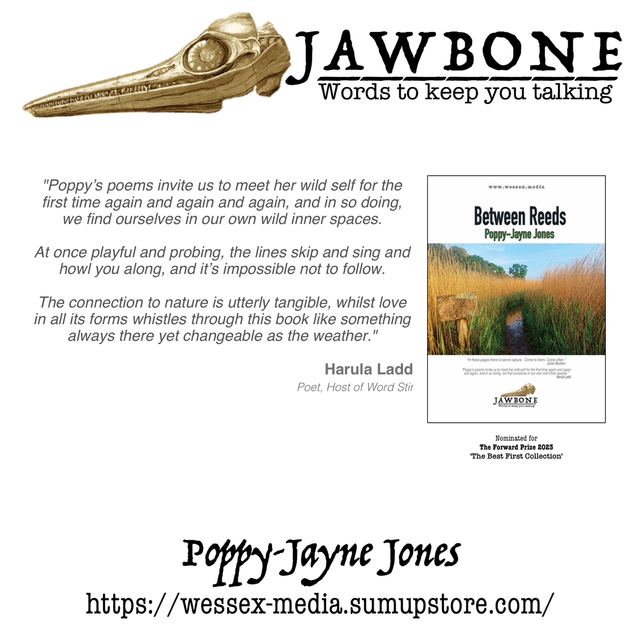 In this, the first poetry collection from Poppy-Jayne Jones she shows us her wild self and takes us by the hand and leads us to the hidden places Between Reeds. In doing so we find ourselves in our own wild inner spaces. At once playful and probing, the lines skip and howl and sing you along, and it’s impossible not to follow. The connection to nature is utterly tangible and love in all its forms whistles through this book like something always there yet changeable as the weather.
